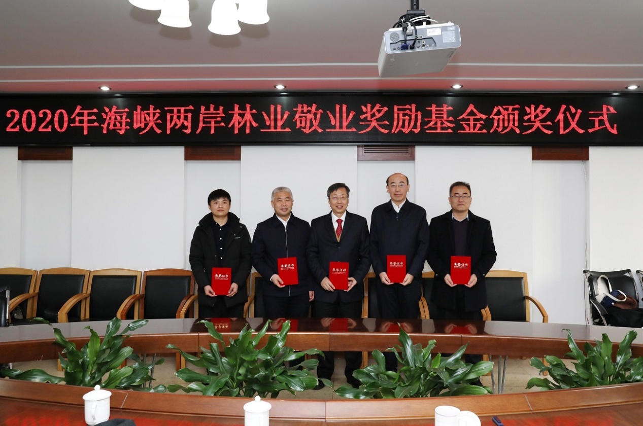 12月19日上午,2020年海峡两岸林业敬业奖励基金颁奖仪式在我校举行。我校党委书记、教育基金会理事长王洪元,校党委副书记孙信丽、基金评委会副主任顾正平教授、评委会委员盛炜彤研究员、赵广杰教授、刘国强研究员及获奖人出席此次颁奖仪式。今年共有五名成就显著的专家学者获得表彰和奖励,他们分别是:东北林业大学顾继友教授,西北农林科技大学赵忠教授,中国林业科学研究院刘世荣研究员、北京林业大学张志强教授、中南林业科技大学闫文德教授。王洪元理事长与评委们一同为五位获奖者颁发了荣誉证书。颁奖仪式由校党委副书记孙信丽主持。