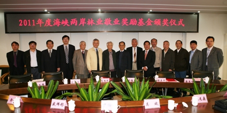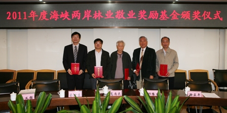 2011年海峡两岸林业敬业奖励基金今天在北京林业大学颁奖。中国林科院研究员高尚武、北京林业大学教授顾正平,南京林业大学教授余世袁,西南林业大学教授潘涌智,中南林业科技大学教授吴义强等5位专家成为新一届获奖者。北京林业大学党委书记、教育基金会理事长吴斌等为获奖者颁发了获奖证书。北林大校党委副书记全海、海峡两岸林业敬业奖励基金管委会主任祁豫生等出席颁奖仪式。